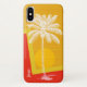 Coque iphone élégant, avec des graphiques d'un palmier sur un arrière - plan abstrait de lever de soleil orange et jaune. Personnalisez le texte personnalisé pour vous-même ou comme une excellente idée cadeau.