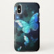 Fabuleux, brillant, bleu et jaune, papillon de nuit sur arrière - plan foncé.