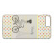 Cadeaux et accessoires chics et modernes, personnalisés avec une fille élégante montant une bicyclette avec la serviette d'Eiffel à l'arrière-plan. Décoré d'un motif de point multicolore de polka.