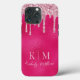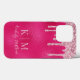 Ce boîtier de téléphone personnalisé élégant est doté d'un arrière - plan glamour de couleur rose chaud avec une texture de papier peint. Des paillettes de parties scintillant rose pâle coulent sur la partie supérieure. Les initiales du monogramme sont placées sous la parties scintillant, suivies d'un exemple de nom imprimé dans une police de script élégante. Vous pouvez personnaliser l'étui téléphonique pour inclure votre propre nom personnalisé et monogramme.