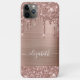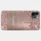 Boîtier de téléphone élégant et girly sur mesure avec parties scintillant en or rose qui s'écoule contre un arrière - plan rose en or faux feuille métallique. Personnalisez avec votre nom dans un élégant script blanc tendance avec des swashes.