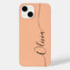 Peach Fuzz Elegant Black Calligraphy Script Personnalisé Nom iPhone 14 Smart Phone Boîtes dispose d'un design moderne et tendance simple et élégant avec votre nom personnalisé dans élégante calligraphie manuscrite typographie de script sur un arrière - plan de pêche fuzz. Conçu par ©Evco Studio www.zazzle.com/store/evcostudio