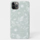 Un étui téléphonique présente des illustrations dessinées à la main de flûtes Peony et Anemone avec un nom personnalisable. Un vert sage élégant avec motif floral blanc pour votre téléphone.