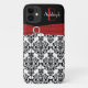 Coque-Mate moderne personnalisé rouge, noir et blanc damassé à peine There™ iPhone 11 Coque avec ruban IMPRIMÉ et broche à bijoux.
