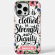 Illustration aquarelle avec bordure florale. A l'intérieur de la frontière, il y a un texte de calligraphie audacieux qui dit "Elle est habillée de force et de dignité Proverbes 31:25". Le texte est dans un style élégant. L'arrière - plan est un rose doux... personnalisé avec son nom.