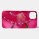 La photographie originale sur ce coque ipad est un plan rapproché d'une fleur rose lumineuse avec large ouvert de pétales. Un arrière - plan de feuille vert peut être vu entre les pétales. La conception du cas est dans le style d'un sac d'embrayage floral de tissu, avec un aileron de replier décrit dans pâle - les perles roses, et un rond ont ombragé la fermeture rose avec une perle au centre. Le centre de la fleur, près du dessus de la bourse, est un ivoire jaune mol se mélangeant dans le rose à ses bords externes hérissés.