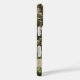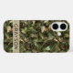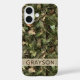 Customize this pine and leaves camouflage iPhone 16 case with your name in a trendy modern CAP font in brown on opaque cream. It's masculine and perfect for your favorite military, hunting, country or outdoorsman!