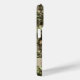 Customize this pine and leaves camouflage iPhone 15 pro case with your name in a trendy modern CAP font in brown on opaque cream. It's masculine and perfect for your favorite military, hunting, country or outdoorsman!