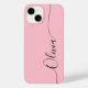 Pink Black Elegant Calligraphy Script Custom Personalized Name iPhone 14 Smart Phone Cases features a modern and trendy simple and stylish design with your personalized name in elegant hand written calligraphy script typography on a soft pink background. Designed by ©Evco Studio www.zazzle.com/store/evcostudio