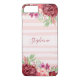 Ce capot iphone personnalisé présente des rayures rose vif avec des roses et des fleurs de pêche bordeaux et rousses. Personnalisez-le avec un nom.