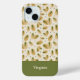 Un étui téléphonique avec un motif de Pistachios et pois verts sur un arrière - plan brun clair et, en bas, un prénom ou un texte personnalisable de votre choix sur un arrière - plan vert. Un beau cadeau pour un ami qui aime les noix.