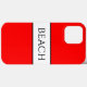 Cette conception sportive présente du texte BEACH à l'intérieur de larges bandes blanches et rouges d'été surlignées en noir.