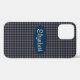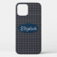 Boîtier de téléphone avec un motif en plaid bleu et beige avec un ovale bleu que vous pouvez customiser avec votre nom.