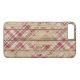 Motif plaid rouge défraîchi avec arrière - plan patiné en bois.