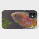 La photographie originale sur ce cas montre une natation naine de poissons de Gourami dans un aquarium. Ce poisson tropical coloré a un corps orange avec les rayures verticales qui semblent bleu-clair iridescent au soleil. Le feuille vert d'un plante sous-marin peut être vu dans un coin de la photo, une partie d'un grand coquillage dans un autre coin derrière les poissons, et l'arrière - plan est un gris moyen texturisé.