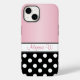 Coque iphone personnalisé personnalisé avec votre nom en rose, et conçu avec des pois blancs sur le noir sur le fond, et une couleur rose dégradé sur le dessus. C'est le coque iphone idéal pour les personnes qui aiment les motifs de pois et la couleur rose. Choisissez votre modèle iPhone pour sélectionner le coque pour vous.