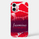 Coque iphone aux motifs animaux clairs dans des tons rouges, blancs et violets audacieux. Personnalisez cet objet avec votre nom complet. Cet exemple est actuellement le suivant : Jasmina Henderson. © Design motif original par Sarah Trett, est basé sur le dessin trouvé sur une girafe avec un moiré mi-teint point gain motif superposition.