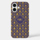 An iPhone 16 case with a seamless repeating purple and gold quatrefoil pattern with fleur de lys symbol (lilies). With a customizable text field for your initials