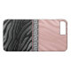 Un design d'impression animale à rayures de zèbre bicolore très féminin et chic dans un dégradé de rose poudré satiné et un chrome noir et argent embossé, divisé par une bannière à clé grecque à texture de pierre et une rayure rose. Mes propres motifs créés numériquement - TOUS LES EFFETS SATINÉS ET MÉTALLIQUES SONT UNIQUEMENT VISUELS.