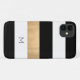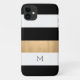 Élégant coque iPhone 11, avec un motif rayé horizontal blanc, noir et or moderne. Personnalisez le monogramme d'une lettre comme une excellente idée cadeau.
