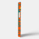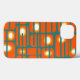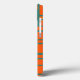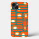 Ce boîtier téléphonique a un design moderne du milieu du siècle de rectangles orange avec des cercles blancs et or dedans et lignes horizontales turquoises les traversant sur un champ de turquoise.