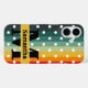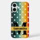 Boîtier de téléphone de style rétro avec un motif de pois blancs sur un arrière - plan coloré de bandes de palette de couleurs rétro. Vers le bas du coque sont deux modèles. L'une pour ajouter votre initiale en lettres noires et l'autre pour ajouter votre nom, également en lettres noires à l'intérieur d'une bande jaune à travers l'initiale.