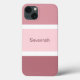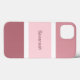 Étui de téléphone portable mignon et élégant avec un motif de rayures rose et blanc. Plusieurs nuances de grandes rayures roses et de petites rayures blanches. Personnalisé avec votre nom imprimé dans un texte rose.
