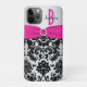 Coque-Mate iPhone 11 Coque personnalisé moderne rose chaud, noir et argent damassé avec IMPRIMÉ SUR ruban et broche à bijoux.