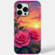 La coque d'iPhone présente un mélange magnifiquement romantique de fleurs luxuriantes et d'un coucher de soleil lumineux et pictural. Deux grandes roses roses dominent le premier plan, leurs pétales pleines, veloutées et détaillées, avec des feuilles vertes douces ajoutant un contraste frais et naturel. Derrière elles, un soleil radieux coule vers l'horizon, jetant des vagues chaudes d'orange, de rose et de lavande à travers le ciel. Les nuages captent ces couleurs dans des dégradés doux et rêveurs, donnant à toute la scène une lueur sereine et presque cinématique.