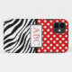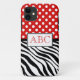 Cas élégant de Casemate de l'iPhone 5 à peine là conçu avec le pois blanc au-dessus du rouge sur la copie de dessus, noire et blanche de zèbre sur le fond, et personnalisé avec vos initiales au milieu.
