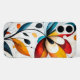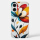 Une seule tige verticale avec des pétales orange et marine abstraits et un point ludique fleurit sur une toile blanche, élégante et moderne.