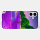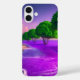 Cette scène océanique a un océan violet et des arbres verts dessus.