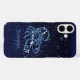 Boîtier de téléphone avec le symbole zodiaque pour Scorpio en bleu argenté doux, recouvert d'étoiles de la constellation, contre un arrière - plan ciel étoilé classé de bleu profond de minuit à noir.