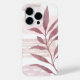 An abstract watercolor featuring patterned shapes and a botanical in a palette of maroon and soft calming colors.
