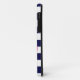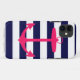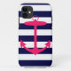 Une silhouette rose néon d'une ancre est sur un arrière - plan rayé bleu marine et blanc. Un design nautique amusant.