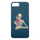 Joyeux squelette souriant avec sa main osseuse reposant sur son menton, réalisé dans des couleurs rétro.