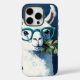 Playful twist to cute animal art and humor with a quirky white llama rocking teal glasses and holding a leafy branch.
