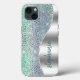 Ce design chic présente une image numérique composée de puces de diamant brillantes et irisées disposées dans un motif imitant serpent dans des tons chatoyants de vert menthe, aqua, turquoise, turquoise, violet et lavande. Une image de feuille d'argent sur la droite en forme d'onde bordée de faux parties scintillant d'argent fournit l'arrière - plan pour votre nom ou monogramme dans une police de brosse turquoise stylisée à la main.