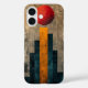 This geometric artwork centers on a vivid red circular form hovering above stacked vertical blocks in deep teal, dark turquoise, and rich mustard yellow. The background is textured with warm beige, muted brown, and subtle gray scratches, giving it an aged, industrial feel. Fine linear markings in charcoal black create a network of abstract lines across the surface. The strong contrast between crimson red, golden ochre, and cool blue-green tones produces striking visual tension. The art style reflects modern geometric abstraction influenced by constructivism and mid-century modern design, emphasizing clean shapes, balanced symmetry, and a harmonious interplay between bold color fields and distressed textures.