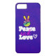 Un étui de téléphone cool funky avec paix et amour écrit dans une police de typographie super. L'illustration est un symbole de paix en forme de main, les doigts soulevés dans le signe v classique, tous faits en couleurs arc-en-ciel. Un petit coeur de gribouillis à côté du mot amour. Design super psychédélique. Arrière - plan violet acide.
