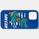 Étui téléphonique cool pour les joueurs de football et les amateurs, ce design a un arrière - plan bleu vif avec un dinosaure T-Rex coloré en vert turquoise avec une chemise rayée d'arbitre jaune et noir donnant un coup de pied à une balle de football. Il y a aussi un modèle de texte à personnaliser avec le nom d'un enfant ou tout autre texte souhaité.