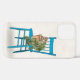 Tabby cat en plante en pots sur chaise en bois turquoise.