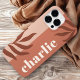Boîtier de téléphone moderne avec votre nom personnalisé aligné verticalement à droite sur un arrière - plan marron en terre cuite et feuilles en terre cuite plus foncé.