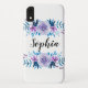 cas de XR d'iPhone avec la conception florale romantique de guirlande d'aquarelle bleue et pourpre et le nom ou le monogramme personnalisable.