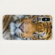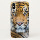 Ce boîtier téléphonique présente un gros plan du visage d'un tigre, où le tigre vous regarde directement et ses marques rayées orange et noir sont montrées en grande vibrations et en détails. Un objet amusant pour les amoureux des animaux et de la faune. Photo prise à San Diego, Californie.