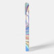 Un tissu métallique turquoise, doré et violet irisé, brillant, avec un grand nom noir.