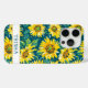 Personnalisez ces tournesols modernes colorés sur une peinture sarcelle pour coque d'iPhone 15 pro avec votre nom dans une police moderne tendance CAP sarcelle sur fond blanc. C'est si beau et joyeux !
