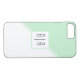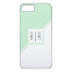 Mint vert et blanc géométrique iPhone 8/7 Coque avec monogramme. L'avant comprend deux bandes diagonales une menthe et une blanche qui séparent la carte en deux triangles. Un carré blanc est au centre avec votre monogramme.