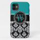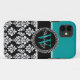 Coques Case-Mate iPhone Turquoise, nom noir d'initiale de motif de damassé