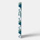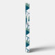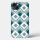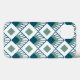 Ce boîtier téléphonique a un design art déco de diamants turquoises avec des lignes diagonales et des diamants verts de mer sur un champ de blanc.